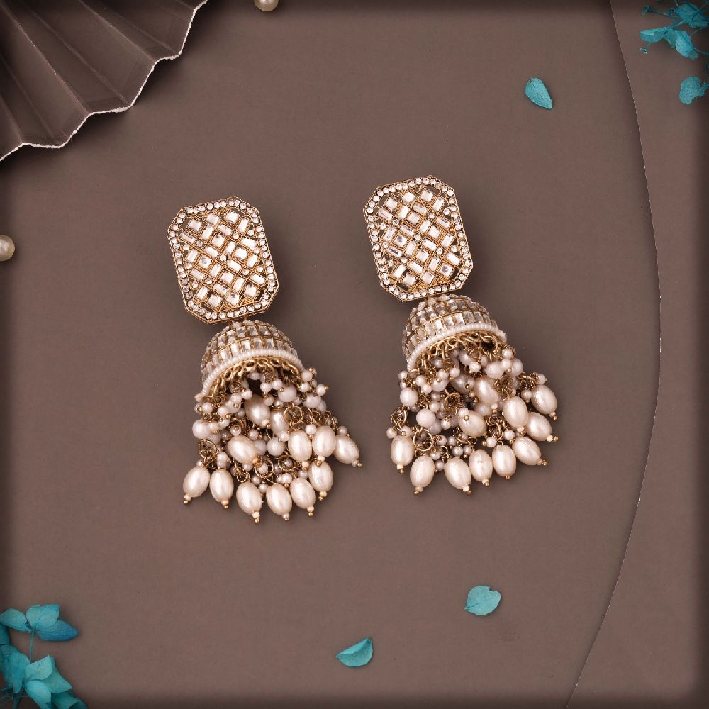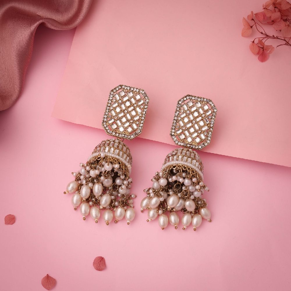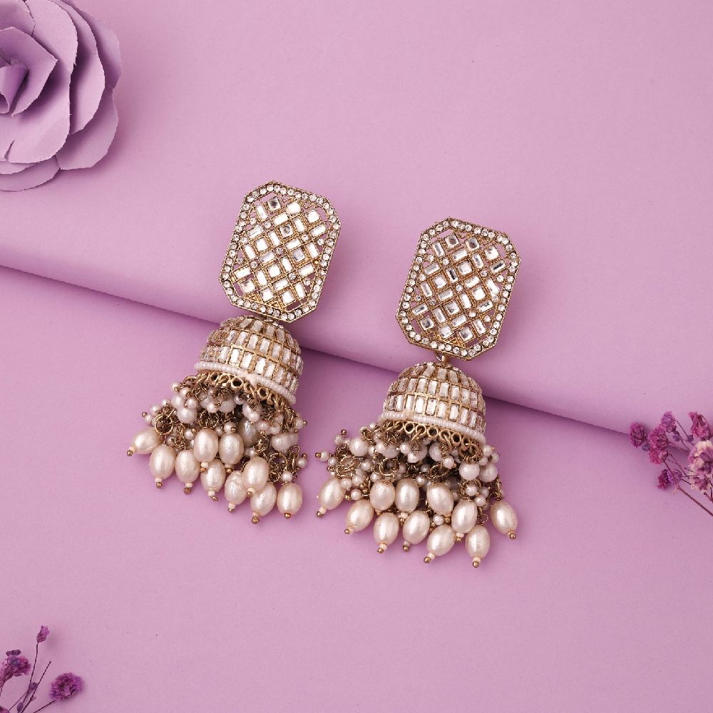 Adorn your ears with the timeless elegance of these Jhumka earrings, featuring Princess Diamond-studded designs and lustrous pearl bead embellishments. Meticulously crafted and plated in gold, these earrings exude opulence and traditional charm. Occasions Ideal for weddings, parties, festive occasions, and special events