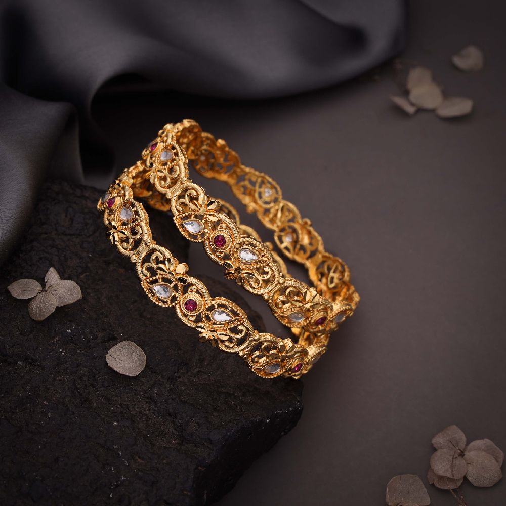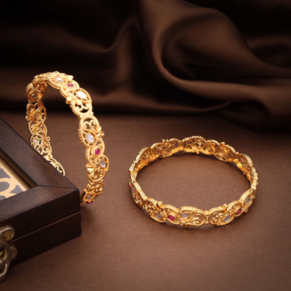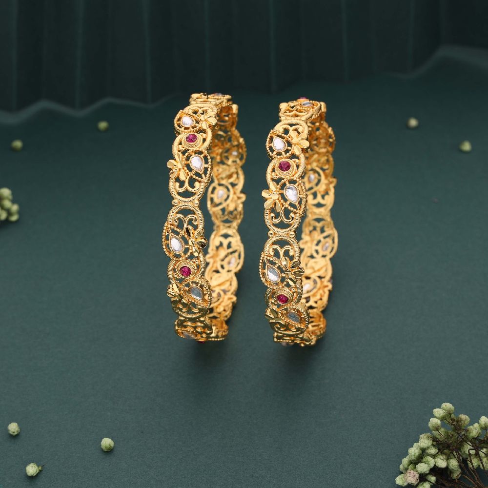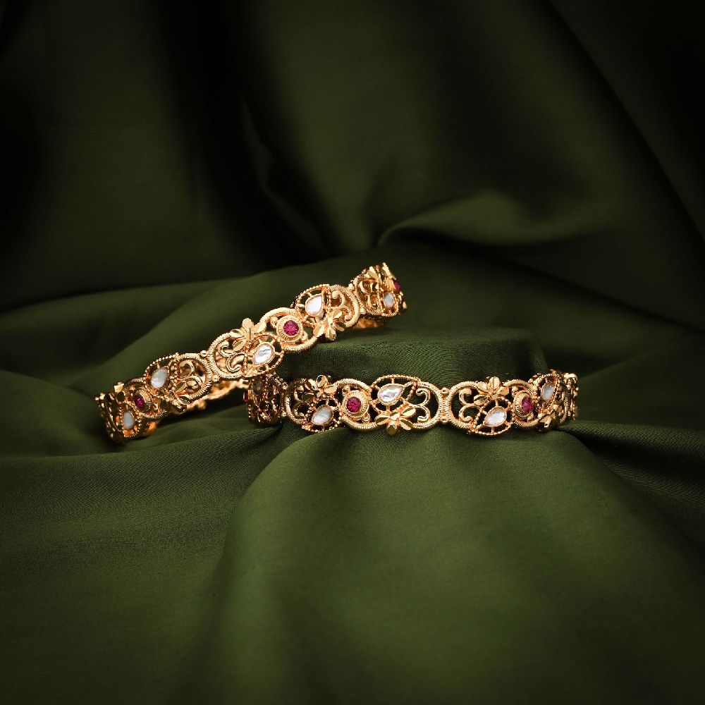 Gold and brass bangles are beautiful accessories that adorn the wrists, but they differ in their composition and appearance. This antique bangle is designed with love and craftsmanship. Bangle set consists of 2 bangles along with the Golden polish. Linked with gemstones, this ornament is a real treat for a stunner like you. The copper-alloy touch of the jewel exudes its timeless beauty and grace while reflecting your unique spirit. Style your ethnic outfit with this regal antique bangle and delight yourself in its luxurious charm. Their lustrous finish adds a touch of sophistication to any outfit, making them a favorite choice for special occasions .