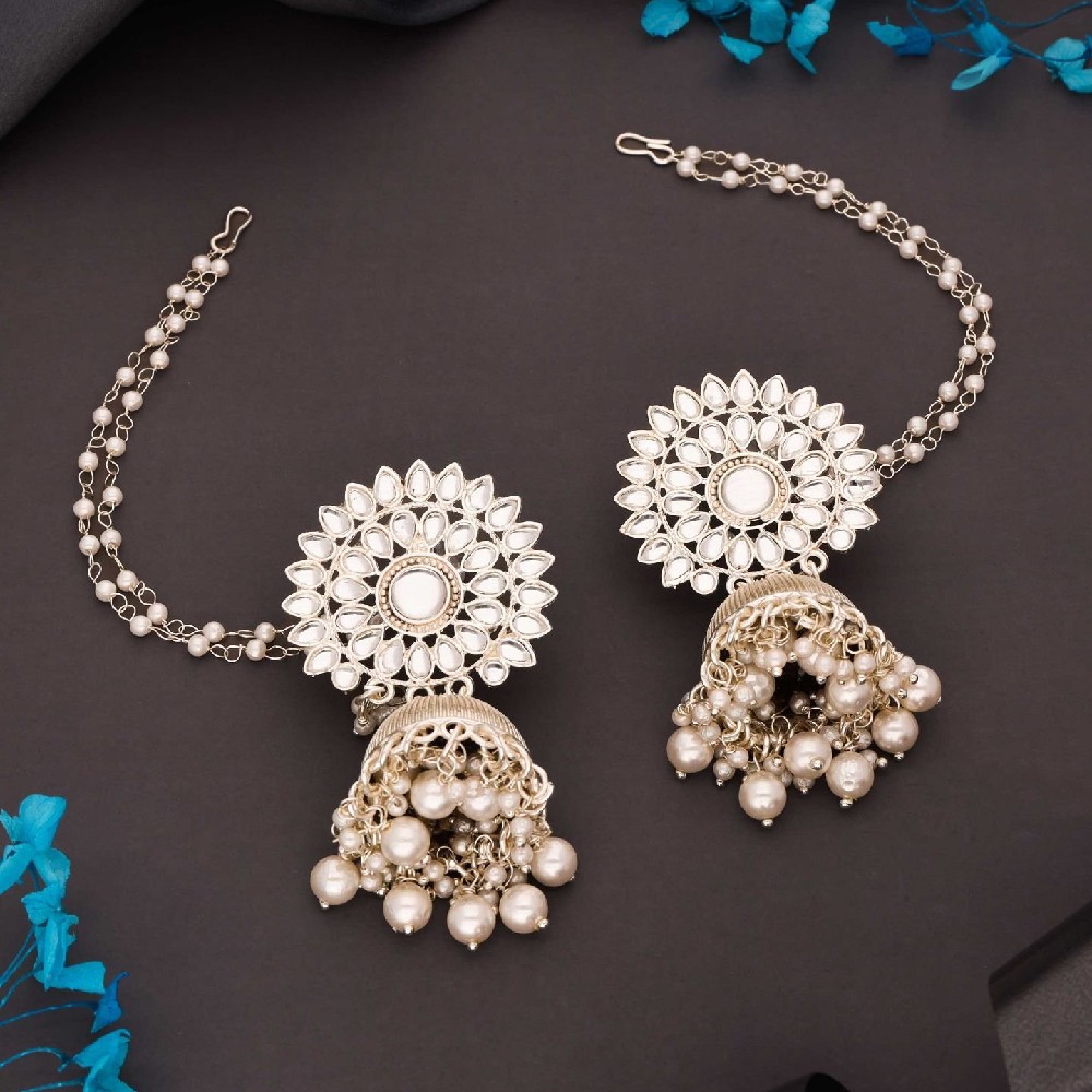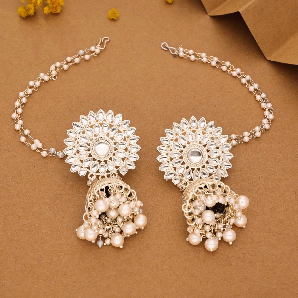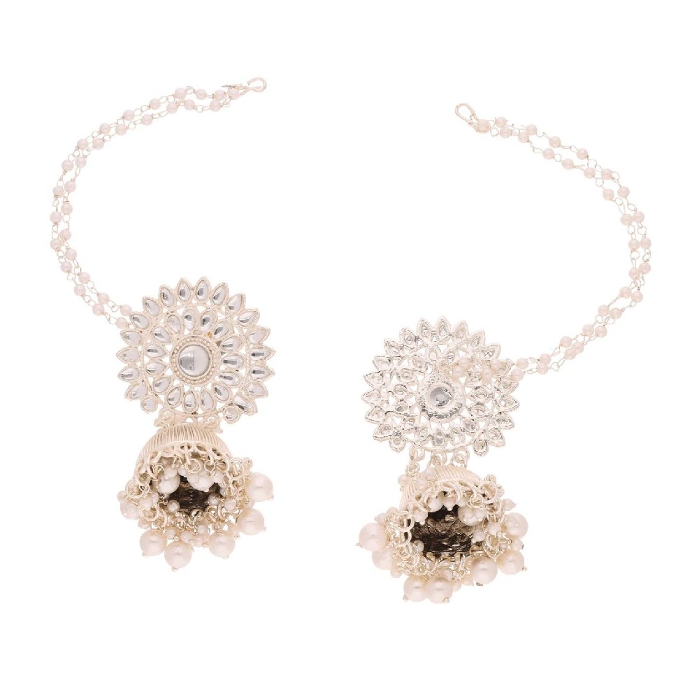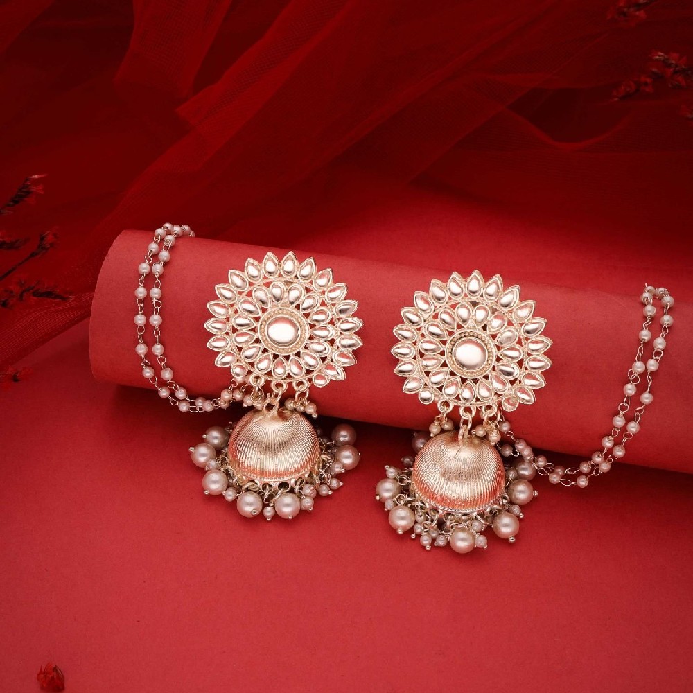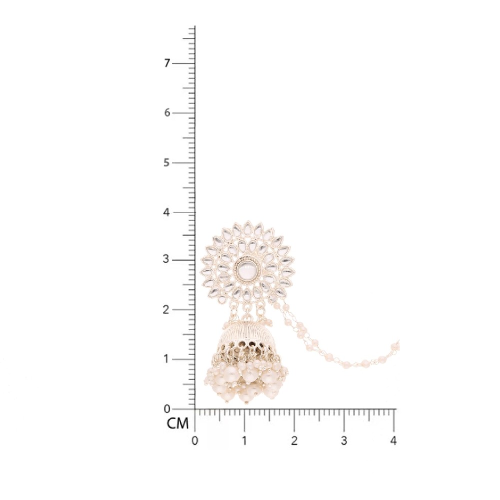 Adorn your ears with the timeless elegance of these Jhumka earrings with chain, featuring Kundan-studded designs and lustrous pearl bead embellishments. Meticulously crafted and plated in gold, these earrings exude opulence and traditional charm. Bring your style to a whole new level with this handcrafted piece of jewellery. When you're celebrating a special Occasion a birthday, wedding, or personal milestone - this piece adds that extra something that makes us feel special and looking our best.