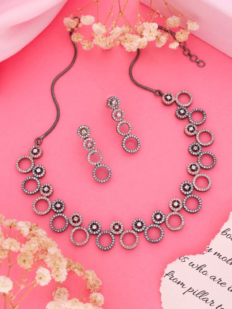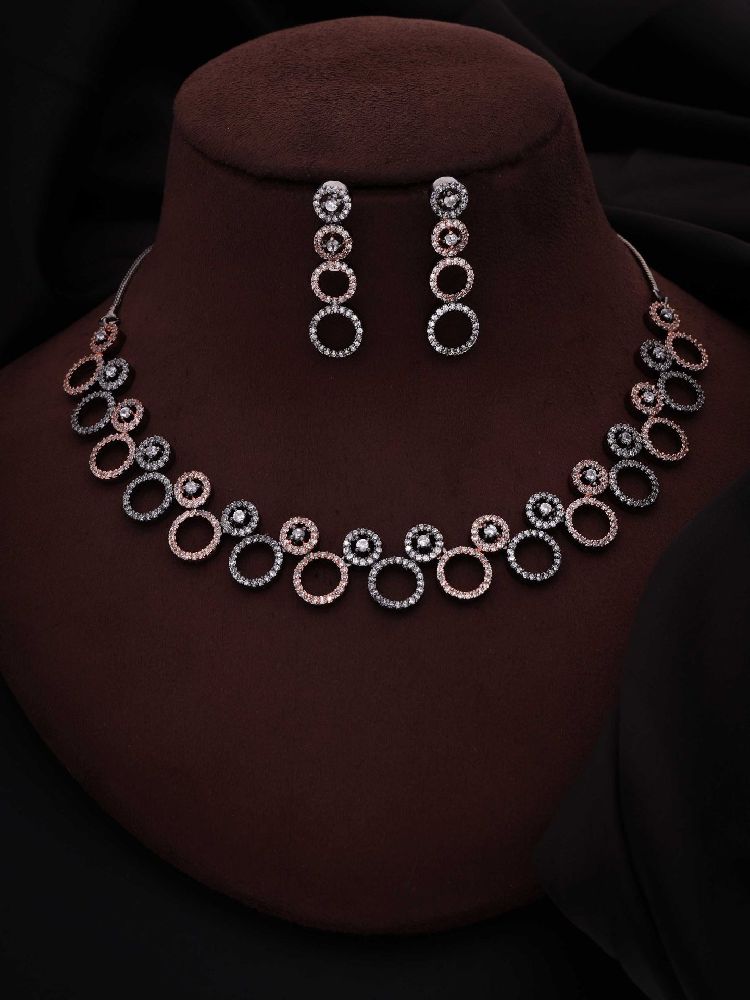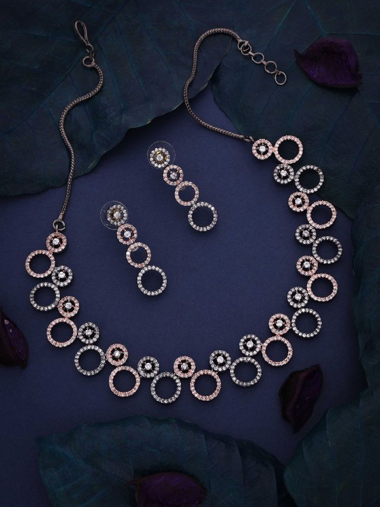 It's a jewellery set fit for the queens! Exude the royal vibe with this stone studded jewellery set. Consisting of a necklace, matching earrings, this necklace set is crafted from rose gold-plated brass, stones and beads.