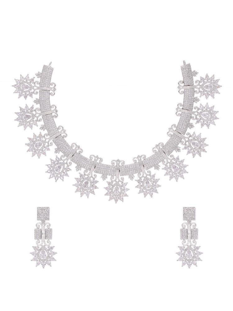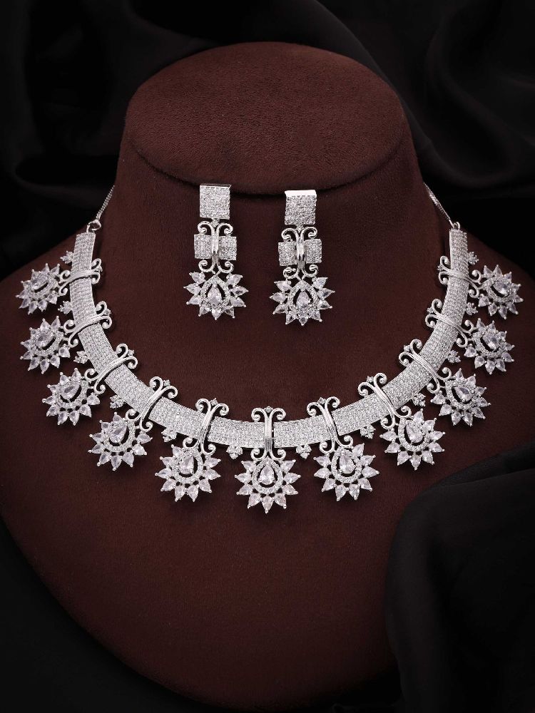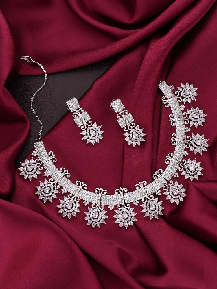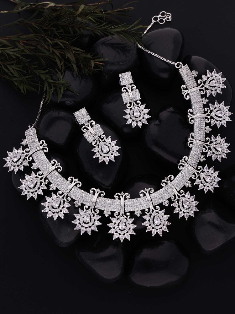 This exquisite ensemble combines the purity of silver with the delicate charm of white stones and the brilliance of AD (American Diamond) accents. The necklace gracefully drapes around your neckline, showcasing a captivating interplay of colors and textures. The white stones exude a gentle femininity, while the AD stones add a subtle sparkle that catches the light with every movement.